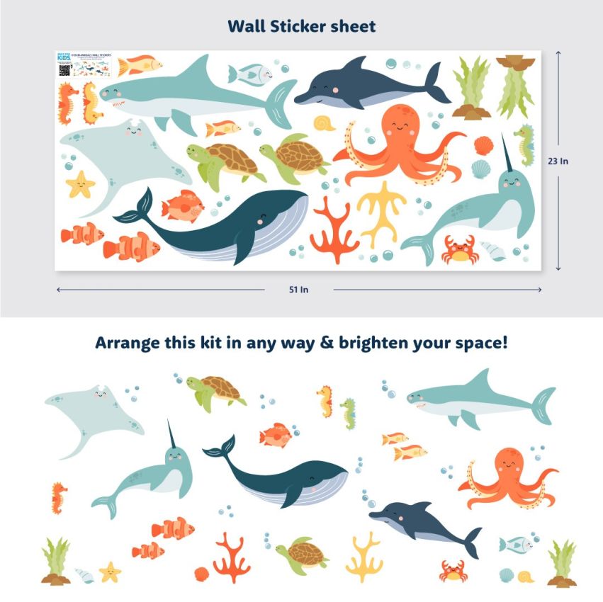 What do I get in the pack?Each pack includes one sheet (51"" x 23"") of printed vinyl with individually cut sea animal wall stickers, including whales, turtles, sharks, and more.