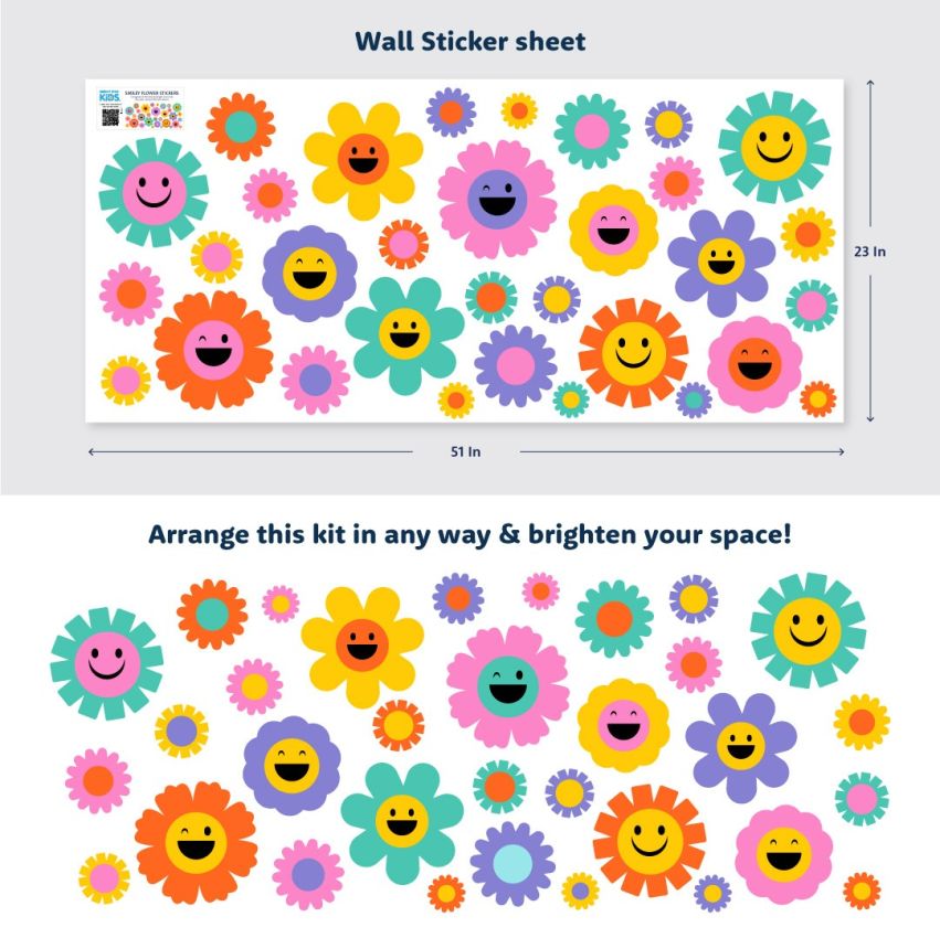 What do I get in the pack?One sheet (51"" x 23"") of printed vinyl with individually cut smiley wall stickers in bright, colorful flower designs.