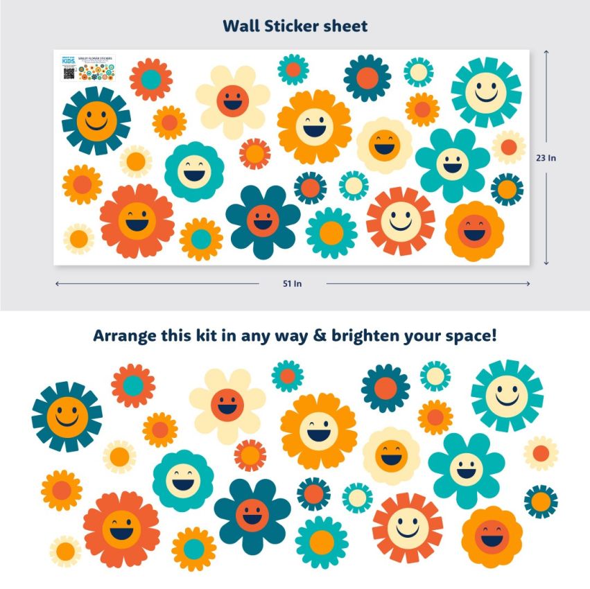 Add flower power to their space with our Retro Smiley Flowers Wall Stickers. Each sheet includes high-quality vinyl decals in a mix of bold colors and retro shapes, printed for a bright, playful finish.