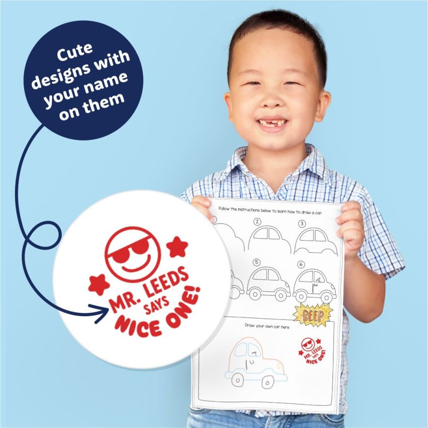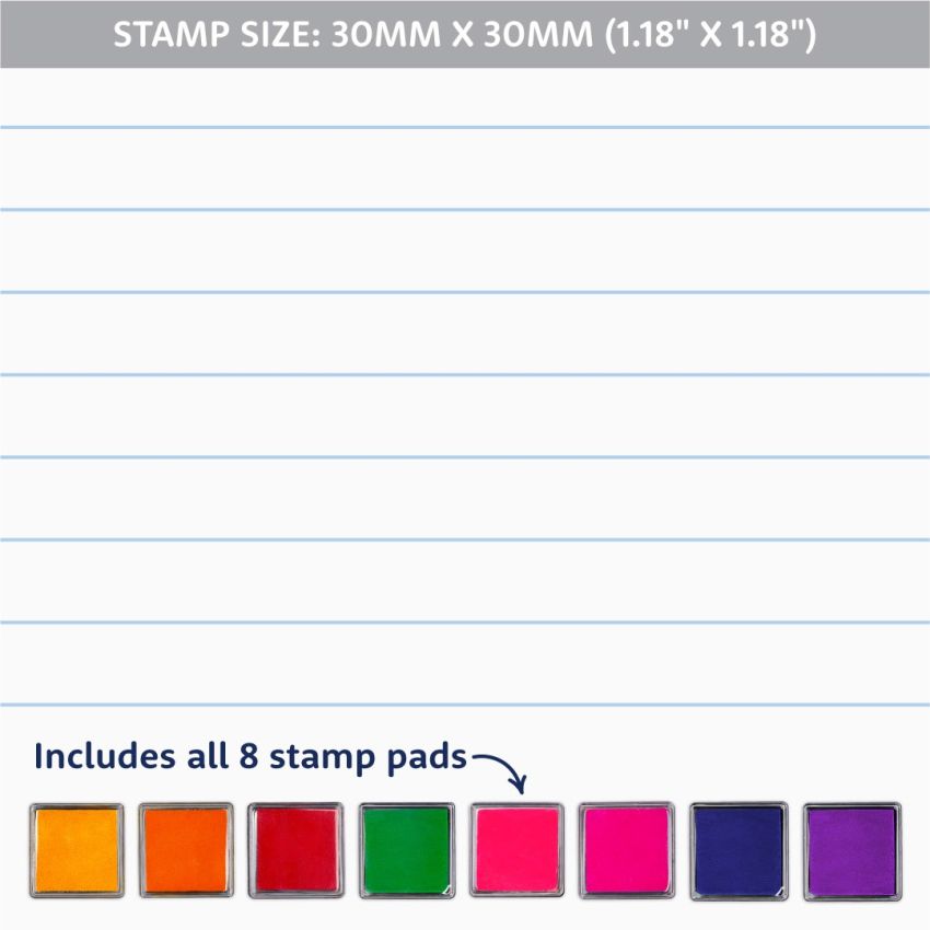 What’s included in the set?Each set comes with a personalised Teacher Stamp and 8 colorful ink pads in a clear tray. Ink colors: Purple, Green, Fluoro Pink, Pink, Yellow, Orange, Red and Blue.