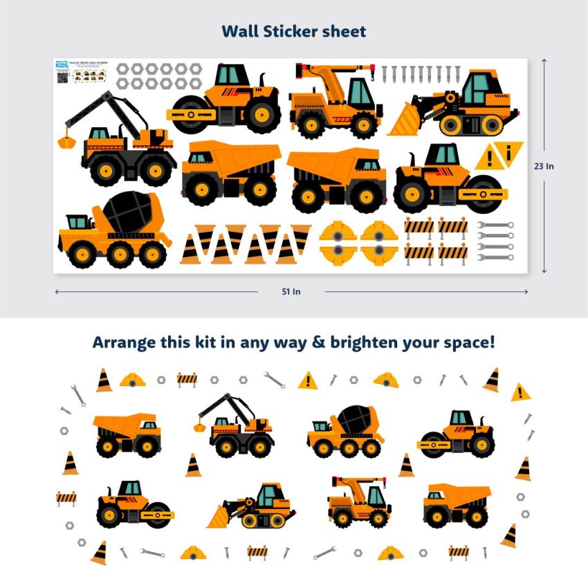 What do I get in the pack?Each pack includes one sheet (51"" x 23"") of pre-cut construction wall stickers, including trucks, cranes, diggers, signs, and tools.
